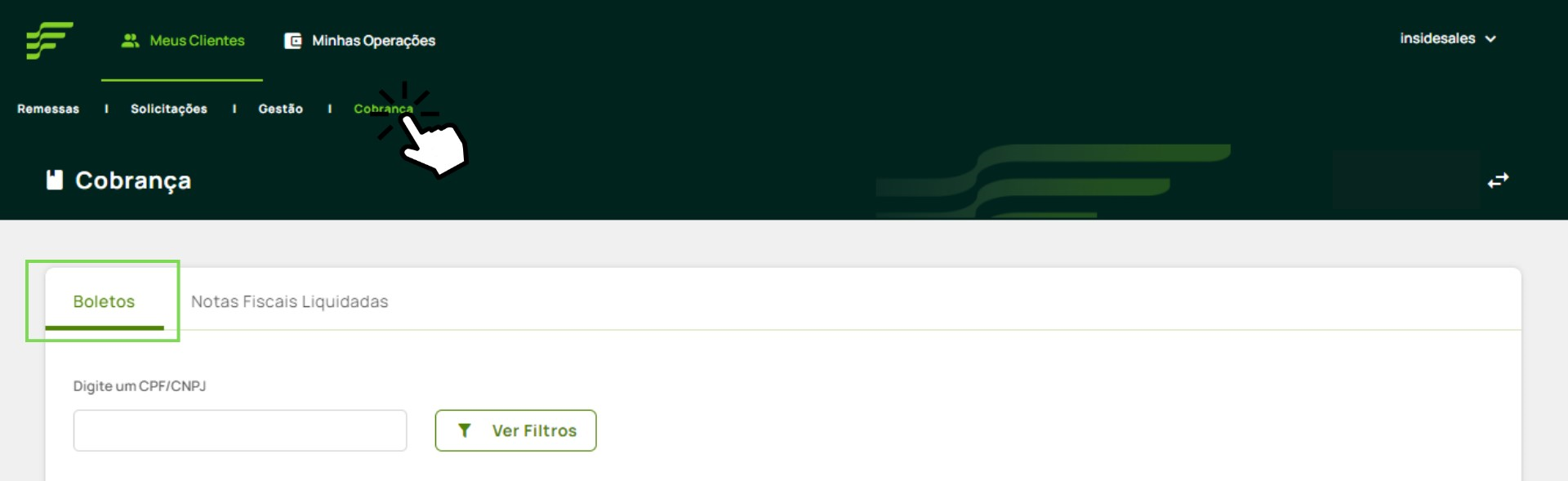 1. Dentro da área logada da Plataforma Farmtech, dirija-se ao menu "Meus clientes" > "Cobrança". Em seguida, selecione a aba "Boletos"