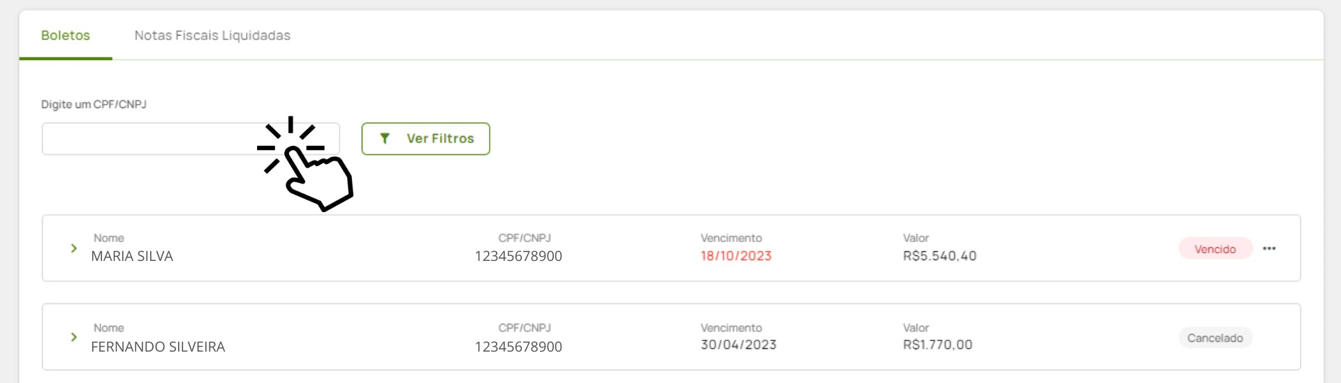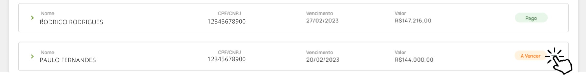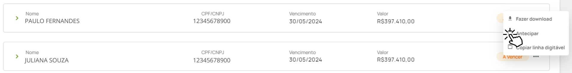 3. Após encontrar o cliente desejado que tenha status "A Vencer", você pode gerar um boleto antecipado. Para isso, clique nas reticências ao lado do Status.