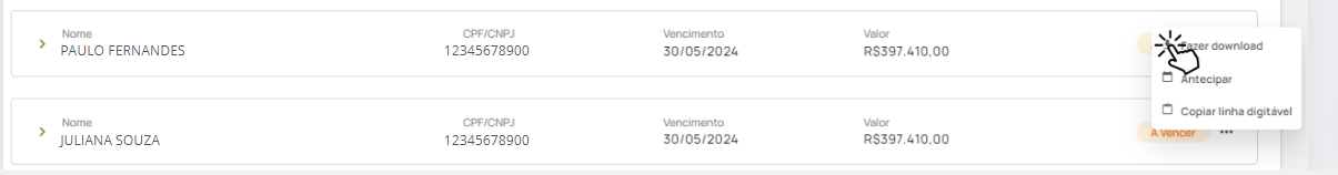5. Após encontrar o cliente desejado que tenha status "A Vencer", você pode gerar um boleto para pagamento. Para isso, clique nas reticências ao lado do Status.
