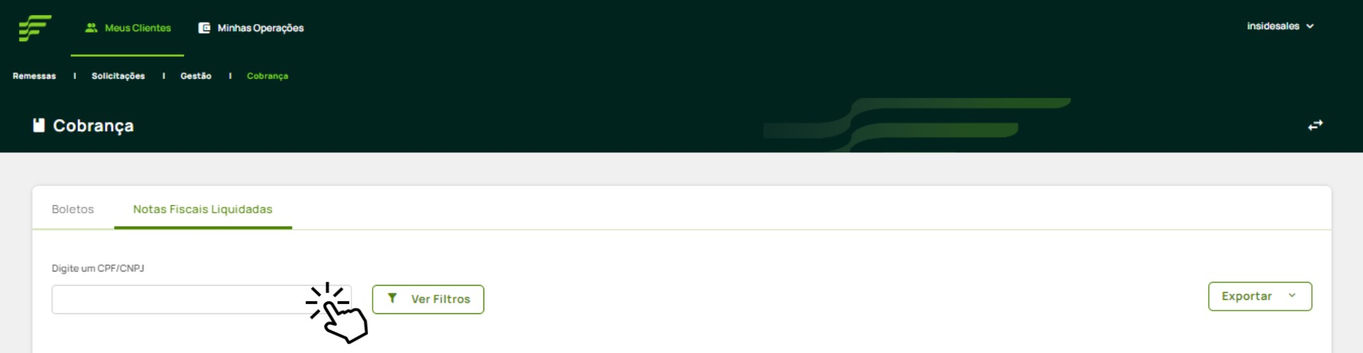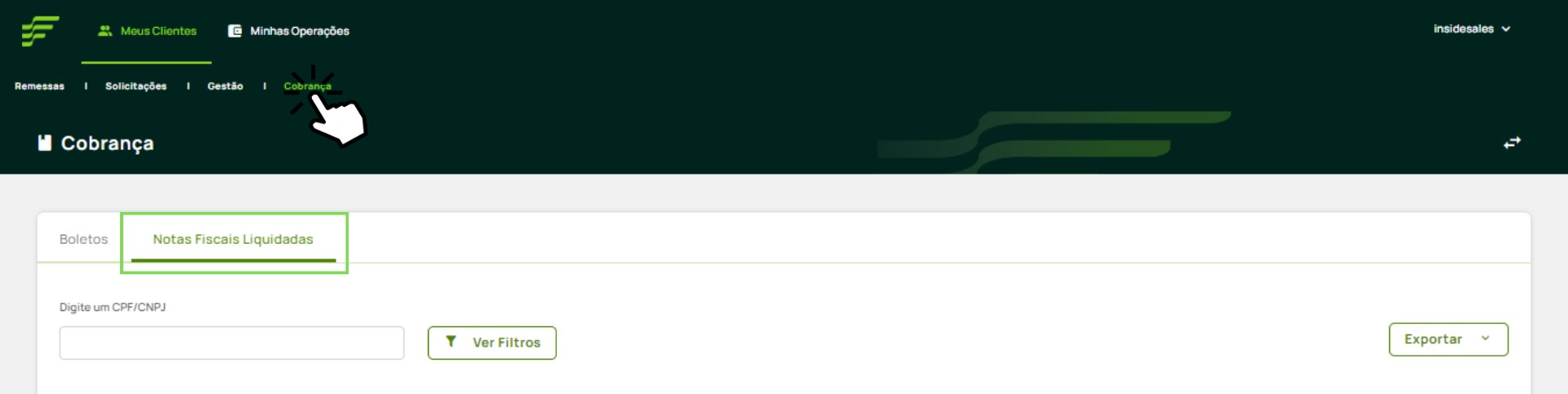 1. Dentro da área logada da plataforma Farmtech, acesse "Meus clientes" > "Cobrança" > "Notas fiscais liquidadas".
