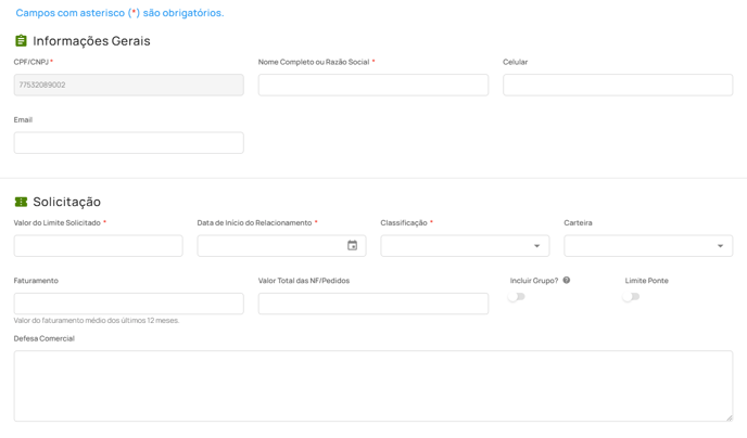 Valor do Limite Solicitado: Preencha com o valor sugerido de limite para o cliente. Após a análise de crédito, essa sugestão poderá ser ou não aceita.