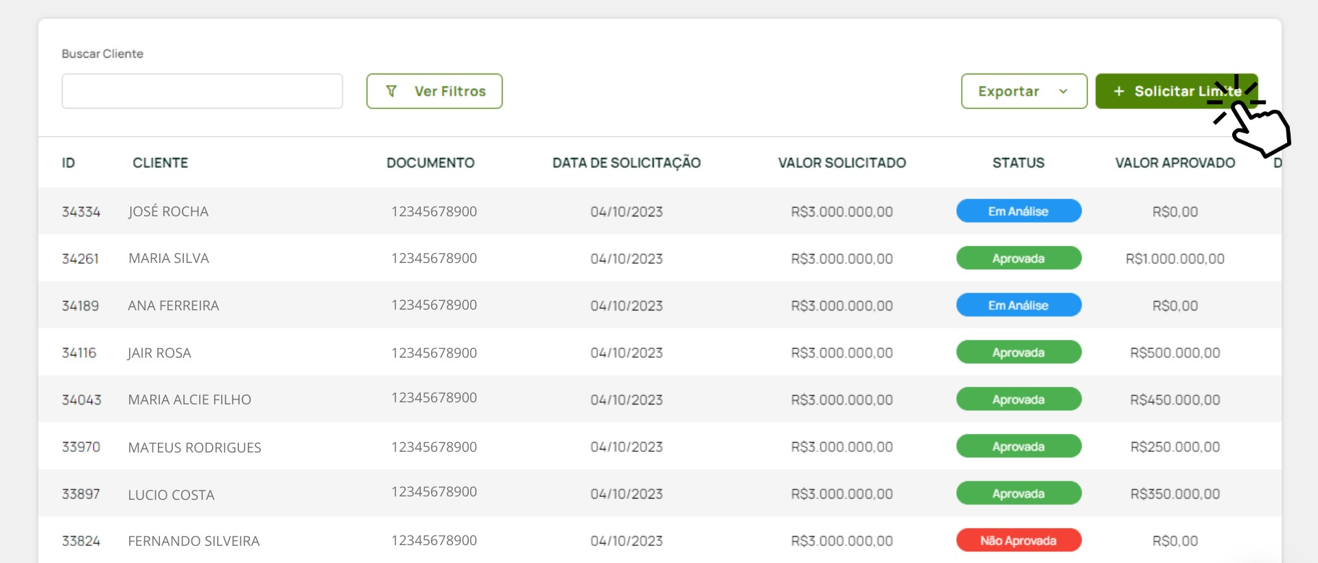 2. Confira os limites já aprovados para seus clientes. Se não encontrar desejado, clique em Solicitar Limite